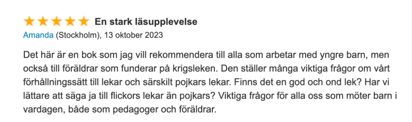 Ännu en bok som Annika varit redaktör för får finfin kritik, den här gången ”Förändringsprocesser i förskolan” av Maria Elbrand och Therés Åkerblom. ”Bokens absoluta styrka är närheten till praktiken…” skriver Bibliotekstjänsts lektör Ulf Malmqvist, och tillägger att den är ”engagerande och lätt att tillgodogöra sig.”. Helhetsbetyg: 4 (mycket bra), näst högst på Bibliotekstjänst femgradiga skala.