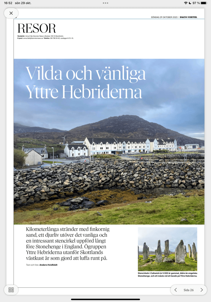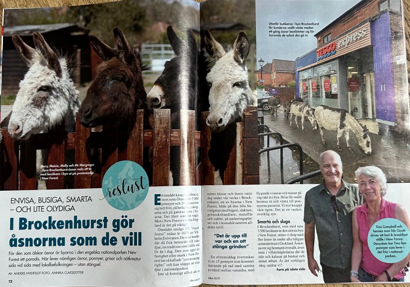 Tre sidor om Yttre Hebriderna i Dagens Nyheter, stort reportage i Allers om byn Brockenhurst i New Forest i England där åsnor lever sida vid sida med lokalbefolkningen och åtta sidor i resemagasinet Vagabond om att skippa flyget och ta tåget till skotska Ullapool och båten över till Stornoway på Yttre Hebriderna. Allt publicerat samma vecka. Inte undra på att vi var smånöjda med medieutfallet.