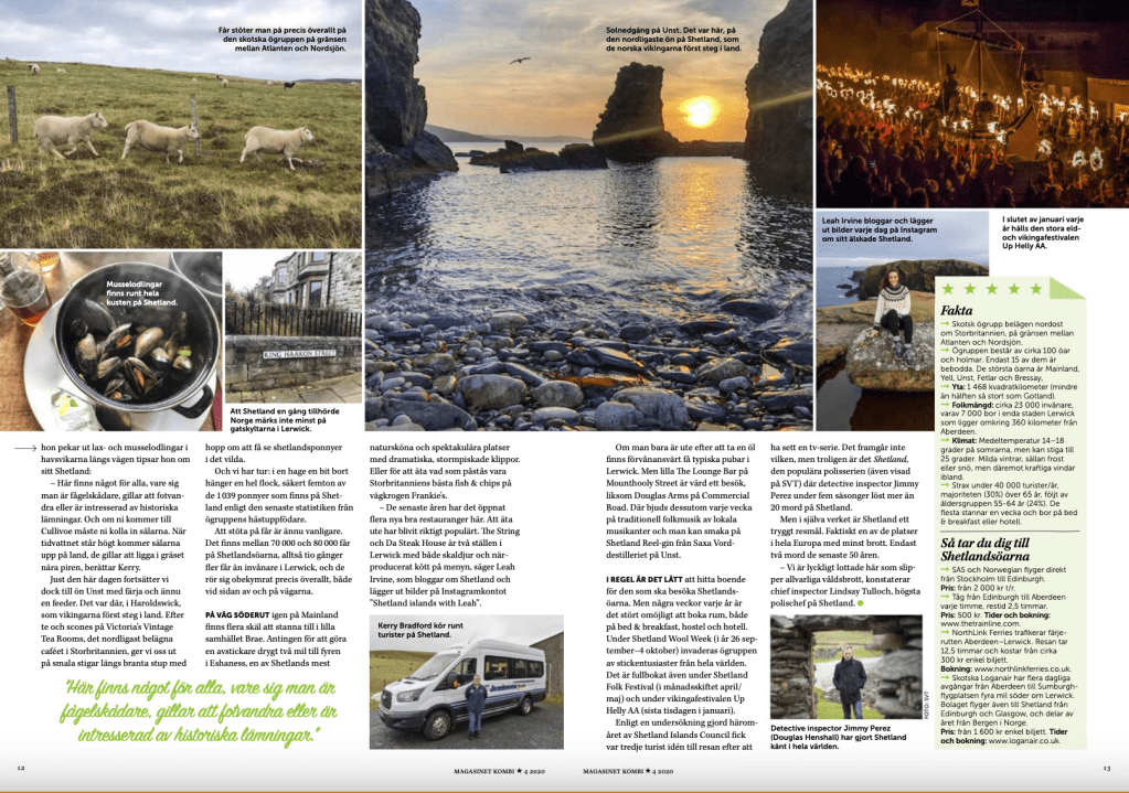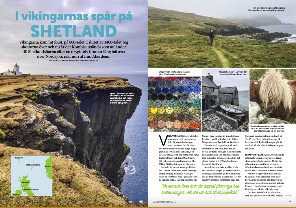 Hösten 2019 reste vi runt på Shetland. Besöket på ögruppen tolv timmars båtresa rakt norrut från Aberdeen resulterade i ett stort resereportage i tidningen Kombi i våras och ytterligare ett knäck om Shetland och Skottland, beställt av Aftonbladet.